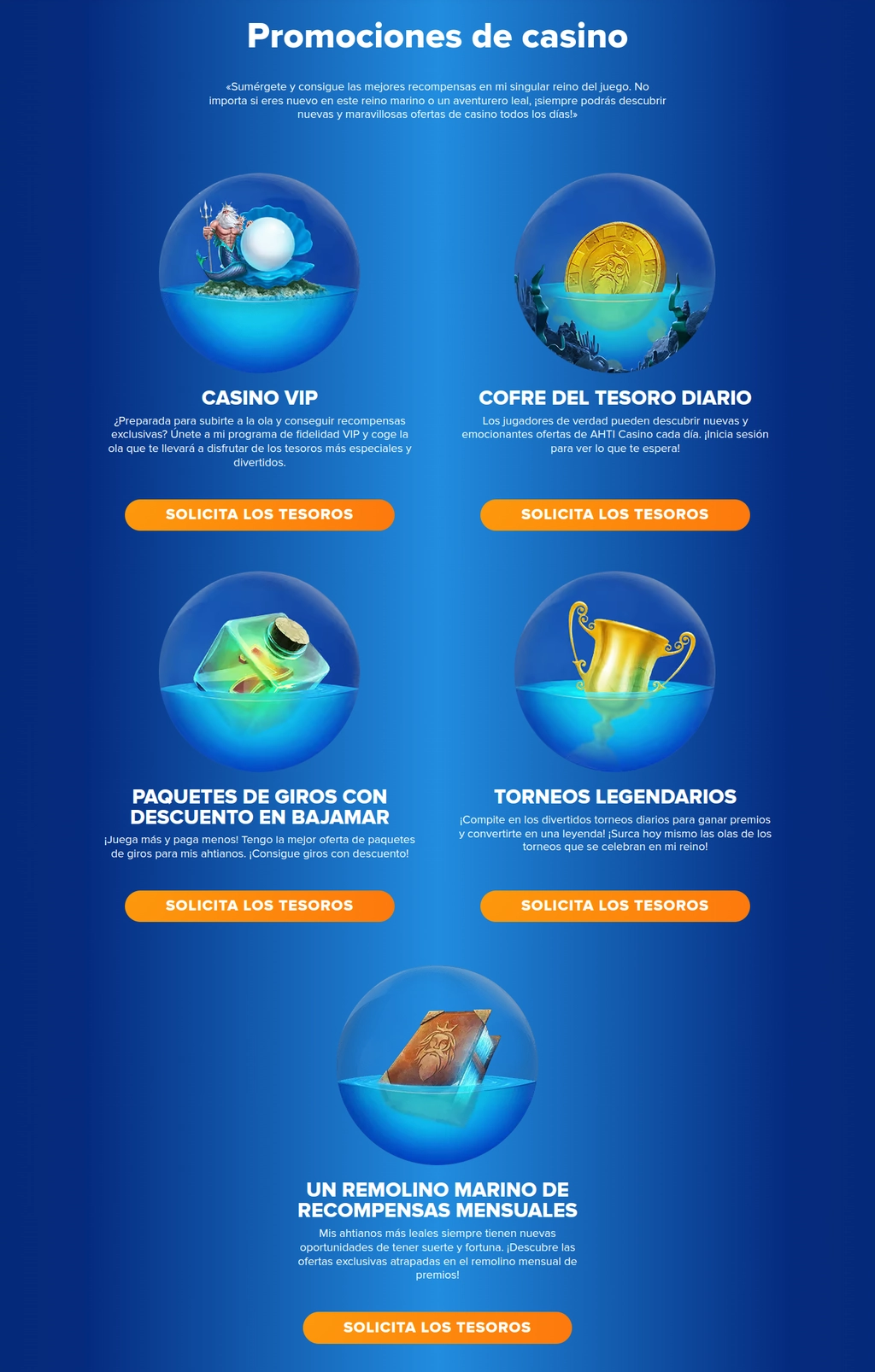 AHTI Games Casino es un magnífico reino de auténtica emoción de juego, con un tesoro legendario que no encontrarás en ningún otro lugar. El poderoso Rey del Mar Ahti es el gobernante, guía, protector y amigo de los jugadores reales en el gran reino de AHTI Games Casino. AHTI Games tiene muchos tesoros, incluyendo fragmentos del legendario Samos. Cualquier jugador de AHTI puede probar suerte para conseguir una pieza. ¿Estás listo para explorar y buscar premios en un vasto océano de juegos de casino? ¡Prueba suerte para conseguir un trozo de Sampo!